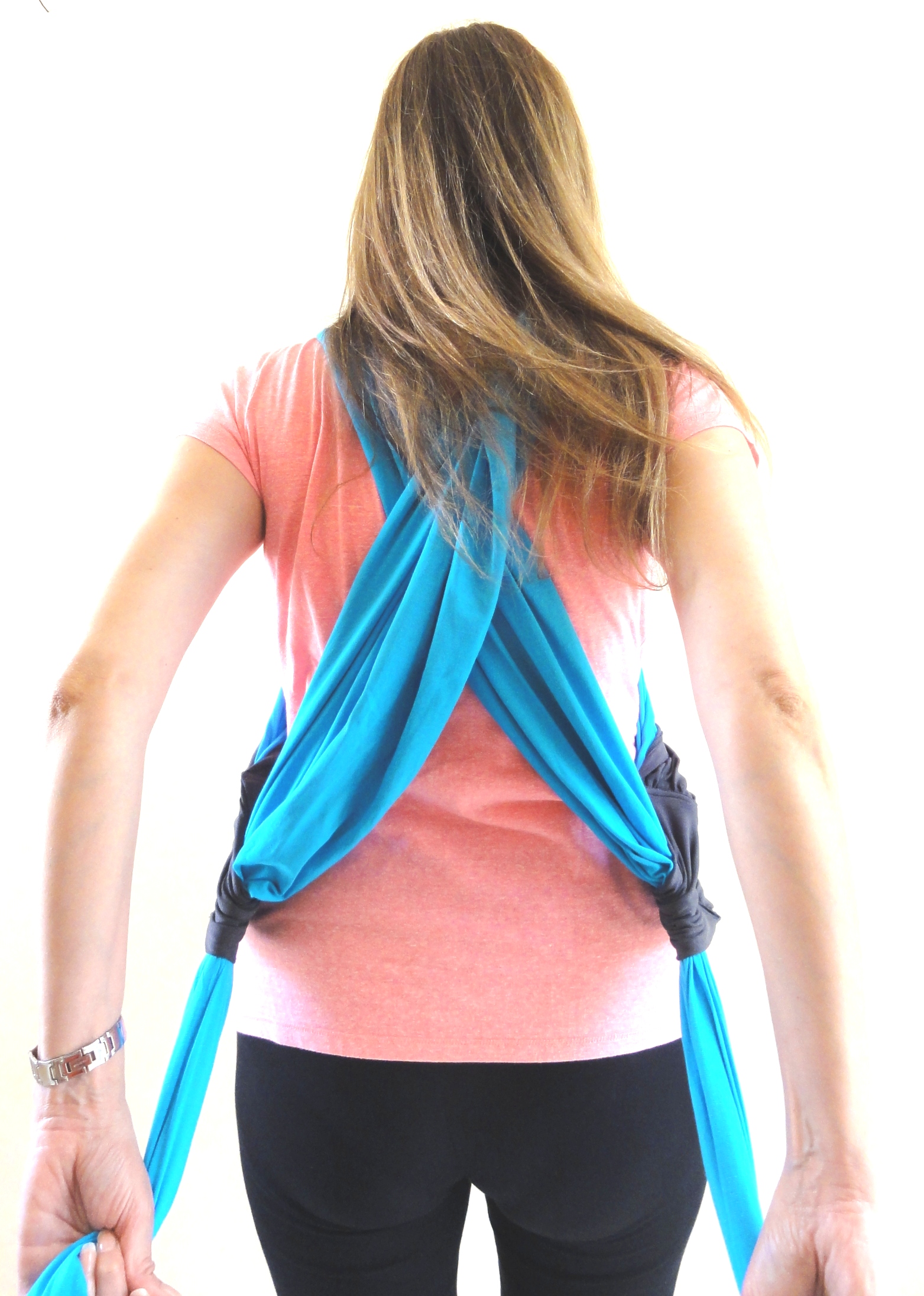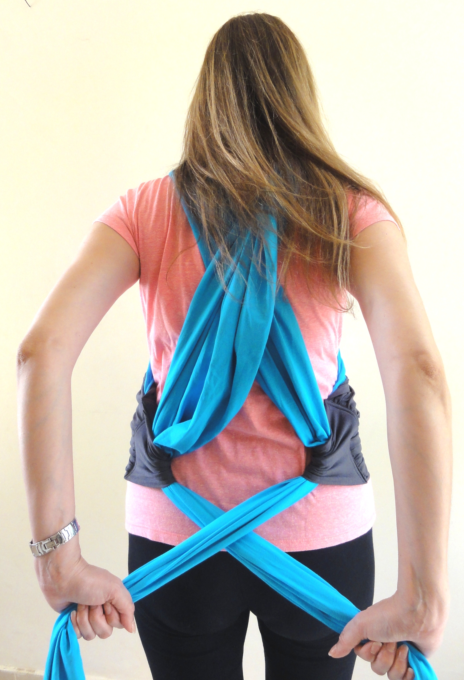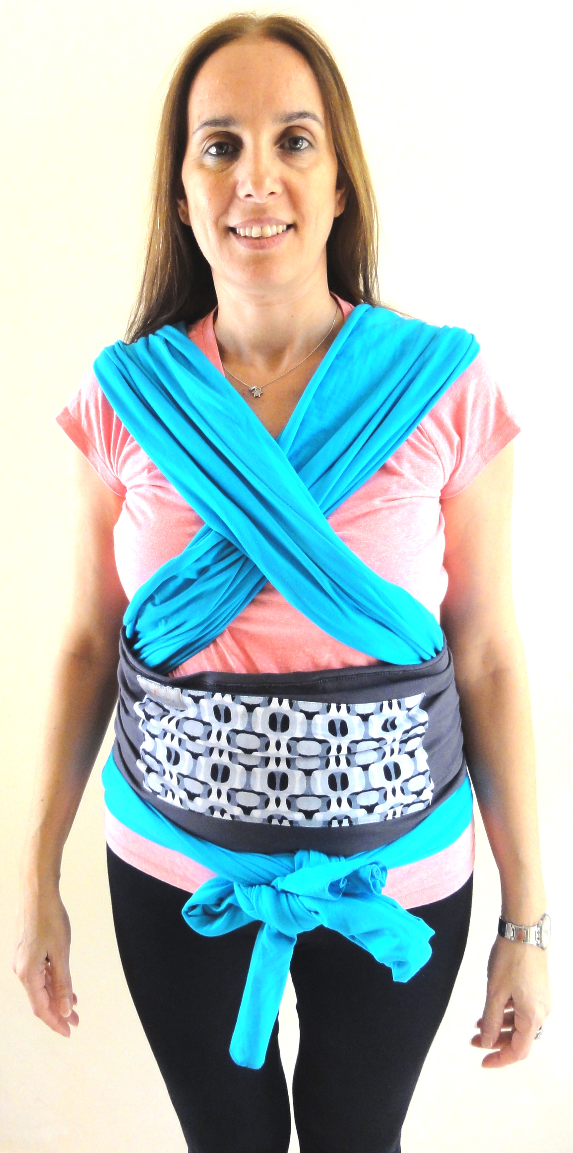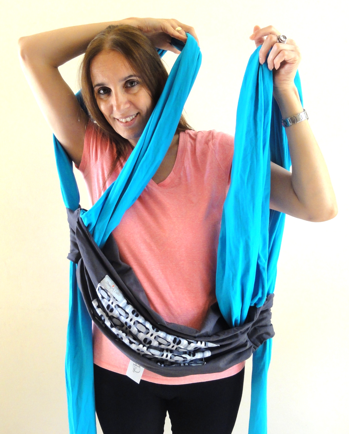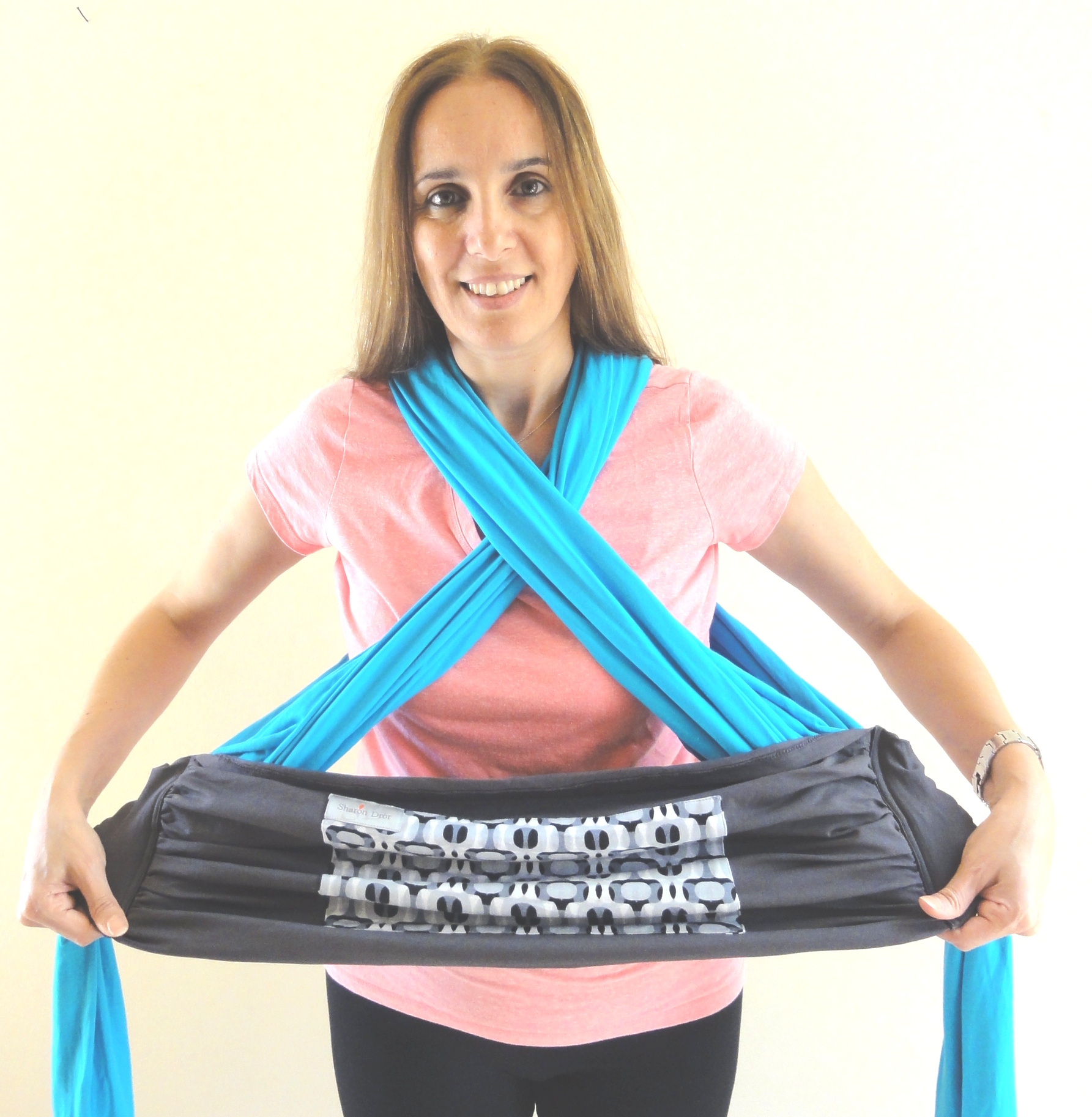 - מכניסים את היד השנייה ומלפפים את הרצועה סביב גוף התינוק.